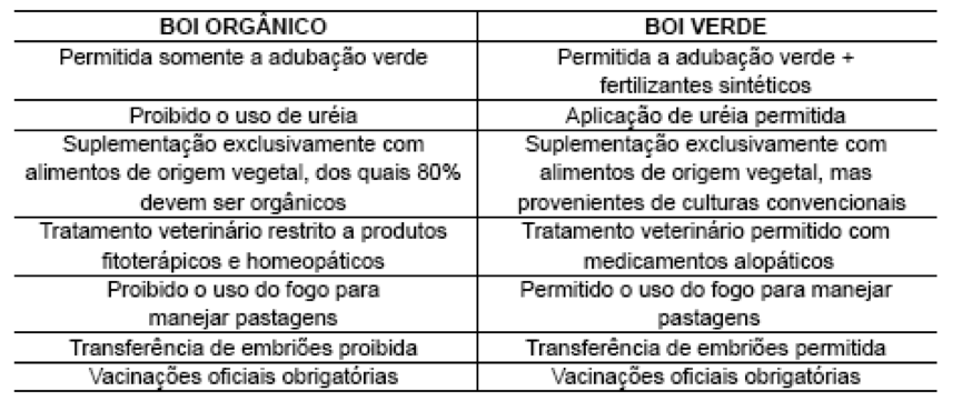 Achei no site do BEEFPOINT um quadro muito fácil para entender a diferença entre o Boi Orgânico e o Boi Verde